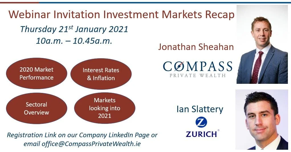 Investments Jonathan Sheahan 8/24/21 Investments Jonathan Sheahan 8/24/21 Our Asset Allocation Philosophy, 2021 Read More Webinar Jonathan Sheahan 7/29/21 Webinar Jonathan Sheahan 7/29/21 July 2021: Investment Strategies Webinar Read More Webinar Jonathan Sheahan 6/24/21 Webinar Jonathan Sheahan 6/24/21 June 2021: Cashflow Planning Webinar Read More Jonathan Sheahan 6/15/21 Jonathan Sheahan 6/15/21 Cashflow Planning 5-min Video Read More Webinar Jonathan Sheahan 5/20/21 Webinar Jonathan Sheahan 5/20/21 May 2021: Economic Update Webinar Read More Jonathan Sheahan 4/25/21 Jonathan Sheahan 4/25/21 Sunday Times Article on Retirement, April 2021 Read More Webinar Jonathan Sheahan 4/15/21 Webinar Jonathan Sheahan 4/15/21 April 2021: Succession Planning Webinar Read More Protection, Webinar, Pensions, Asset Allocation Jonathan Sheahan 4/2/21 Protection, Webinar, Pensions, Asset Allocation Jonathan Sheahan 4/2/21 March 2021: Protection Webinar Compass Private Wealth ran a Webinar on Protection, covering both Life Insurance and Income Protection. Read More Webinar Jonathan Sheahan 2/25/21 Webinar Jonathan Sheahan 2/25/21 February 2021: Retirement Planning Webinar Read More Webinar Jonathan Sheahan 1/20/21 Webinar Jonathan Sheahan 1/20/21 January 2021: Investment Markets Webinar Read More Webinar Jonathan Sheahan 11/26/20 Webinar Jonathan Sheahan 11/26/20 November 2020: Tax & Investing Webinar Read More Webinar Jonathan Sheahan 10/23/20 Webinar Jonathan Sheahan 10/23/20 October 2020: Risk Management & Protection Read More Newer Posts